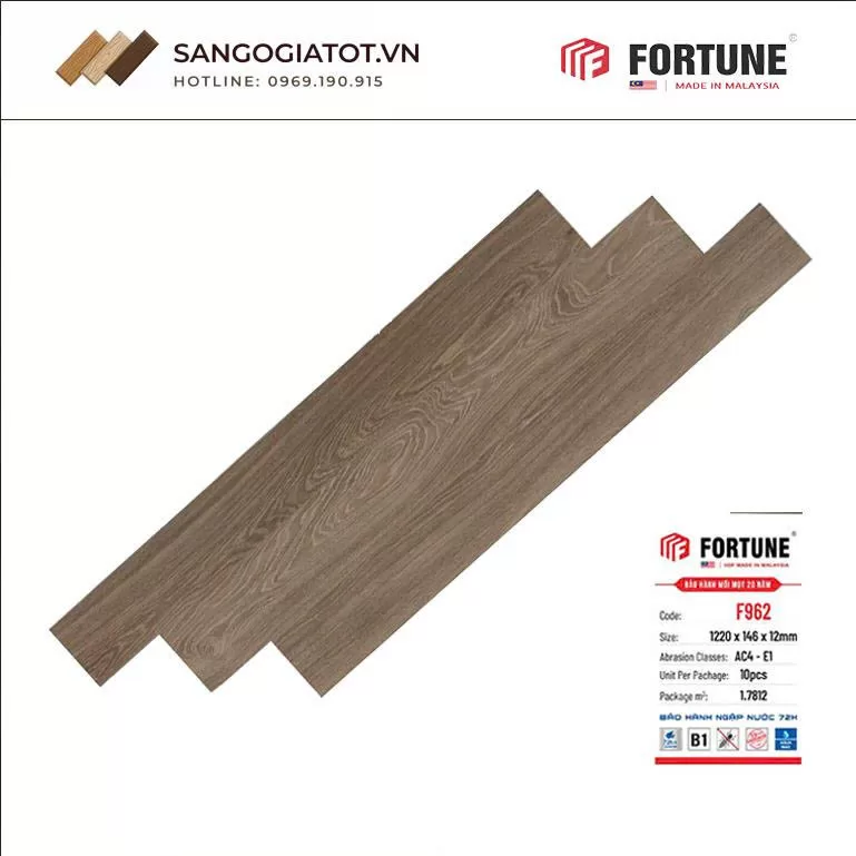 Sàn gỗ Fortune 12mm – F962 là dòng sản phẩm thuộc phân khúc cao cấp, được sản xuất trên dây chuyền hiện đại với cốt gỗ HDF nhập khẩu từ Malaysia – quốc gia nổi tiếng với công nghệ sản xuất sàn gỗ hàng đầu thế giới.