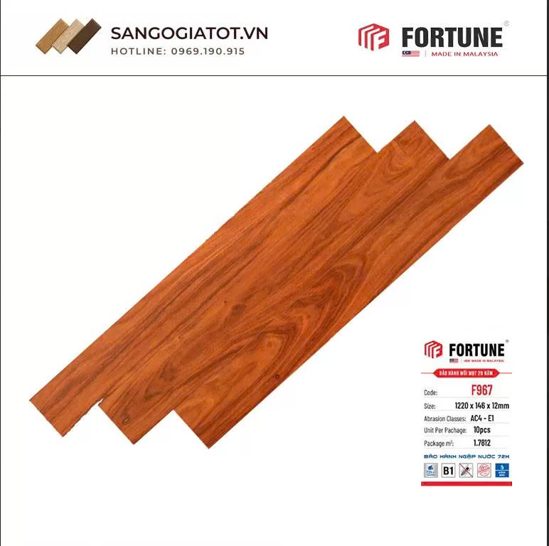 Sàn gỗ Fortune 12mm – F967 là lựa chọn phù hợp cho nhiều công trình hiện đại. Sản phẩm có độ bền cao, thiết kế đẹp và khả năng chịu lực tốt. Tiêu chuẩn AC4 – B1 – E1 đảm bảo an toàn và sử dụng ổn định. Bảo hành 25 năm giúp người dùng yên tâm khi lựa chọn. Đây là giải pháp lát sàn bền đẹp và hiệu quả kinh tế lâu dài.