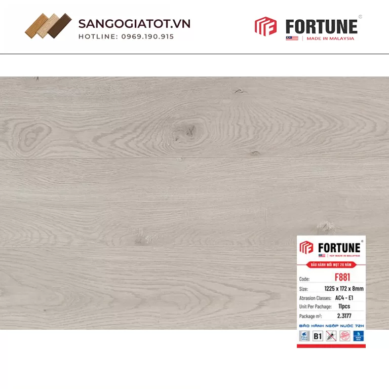 Sàn gỗ Fortune F881 thuộc dòng sàn gỗ công nghiệp cao cấp với cốt gỗ HDF sản xuất tại Malaysia – một trong những quốc gia nổi tiếng về công nghệ sản xuất sàn gỗ.
