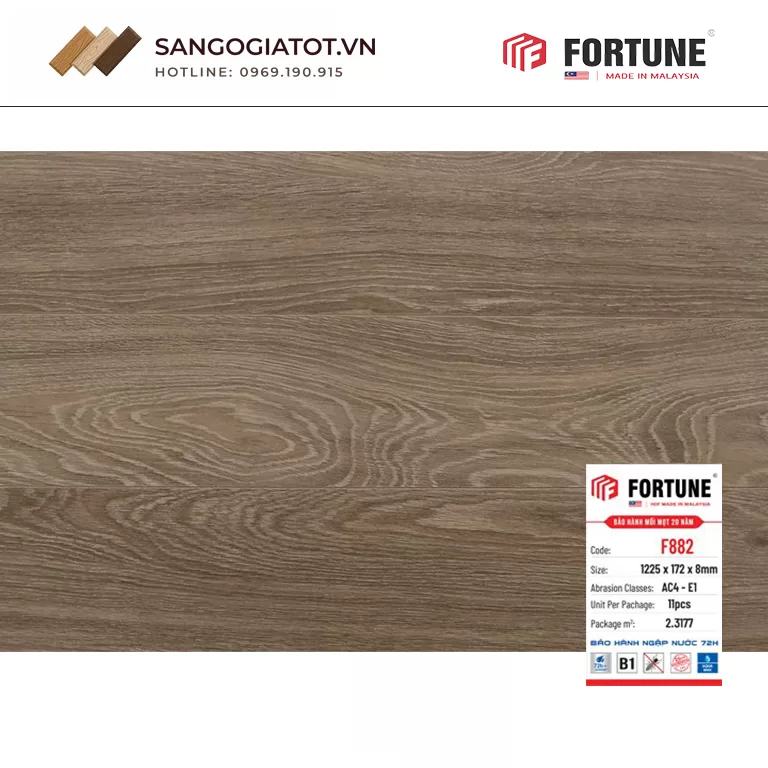 Sàn gỗ Fortune 8mm – F882 mang đến vẻ đẹp vân gỗ tự nhiên, tạo không gian sống sang trọng, ấm cúng. Sản phẩm đạt chuẩn AC4, B1, E1, đảm bảo độ bền cao, an toàn và thân thiện sức khỏe. Khả năng chịu lực, chống trầy xước tốt, phù hợp khu vực có mật độ sử dụng thường xuyên. Thiết kế hèm khóa thông minh giúp thi công nhanh, tăng tính thẩm mỹ và tiết kiệm chi phí. Fortune F882 là giải pháp sàn gỗ công nghiệp bền đẹp, kinh tế cho mọi công trình. Nếu bạn đang tìm kiếm một dòng sàn gỗ công nghiệp vừa đẹp, bền, an toàn lại có chi phí hợp lý, Fortune F882 chắc chắn là lựa chọn đáng để đầu tư cho mọi công trình.