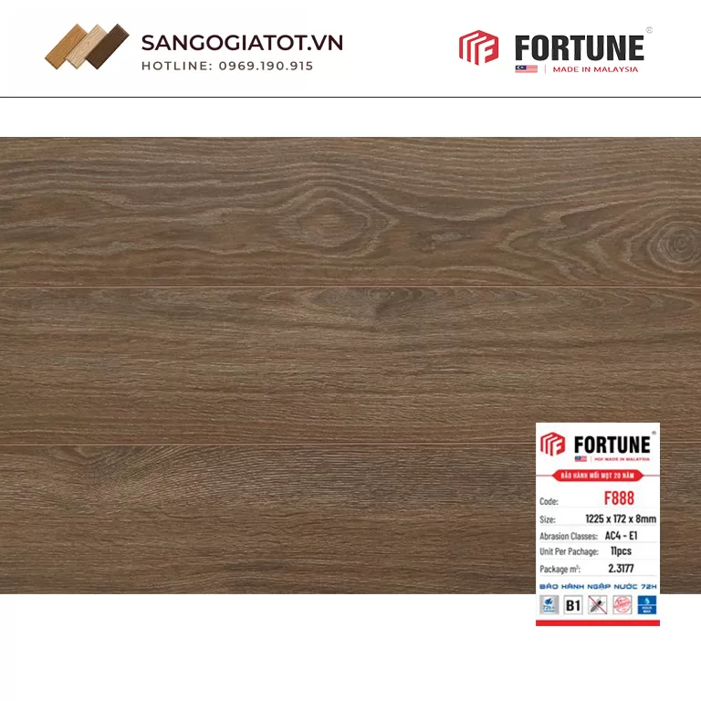 Sở hữu cốt gỗ HDF Malaysia chất lượng cao, tiêu chuẩn kỹ thuật đạt chuẩn quốc tế cùng thời gian bảo hành dài hạn, Fortune F888 là giải pháp lát sàn đáng đầu tư cho cả không gian nhà ở lẫn thương mại.