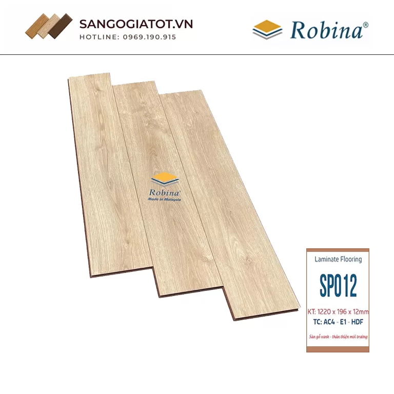 Sàn gỗ Robina SP012 thuộc dòng sàn gỗ công nghiệp cao cấp, nổi bật với độ dày 12mm chắc chắn và thiết kế bản lớn sang trọng.